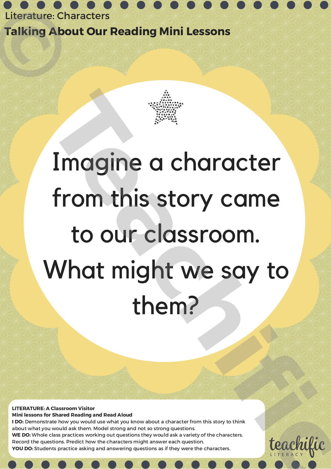 There’s a whole collection of character Book Chat reading and writing prompts to explore with your learners. Each prompt come with the mini lesson ideas; how to model your thinking, how to get your students thinking and talking with you and some prompts include how to model a written response. Templates to support your writers are included when relevant.