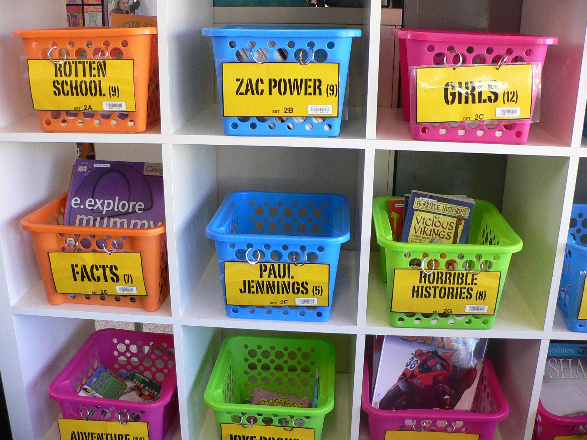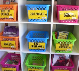 - Organise for books to be displayed in inviting ways: with covers facing out, sorted into categories/themes/genres in labelled baskets, on book shelves