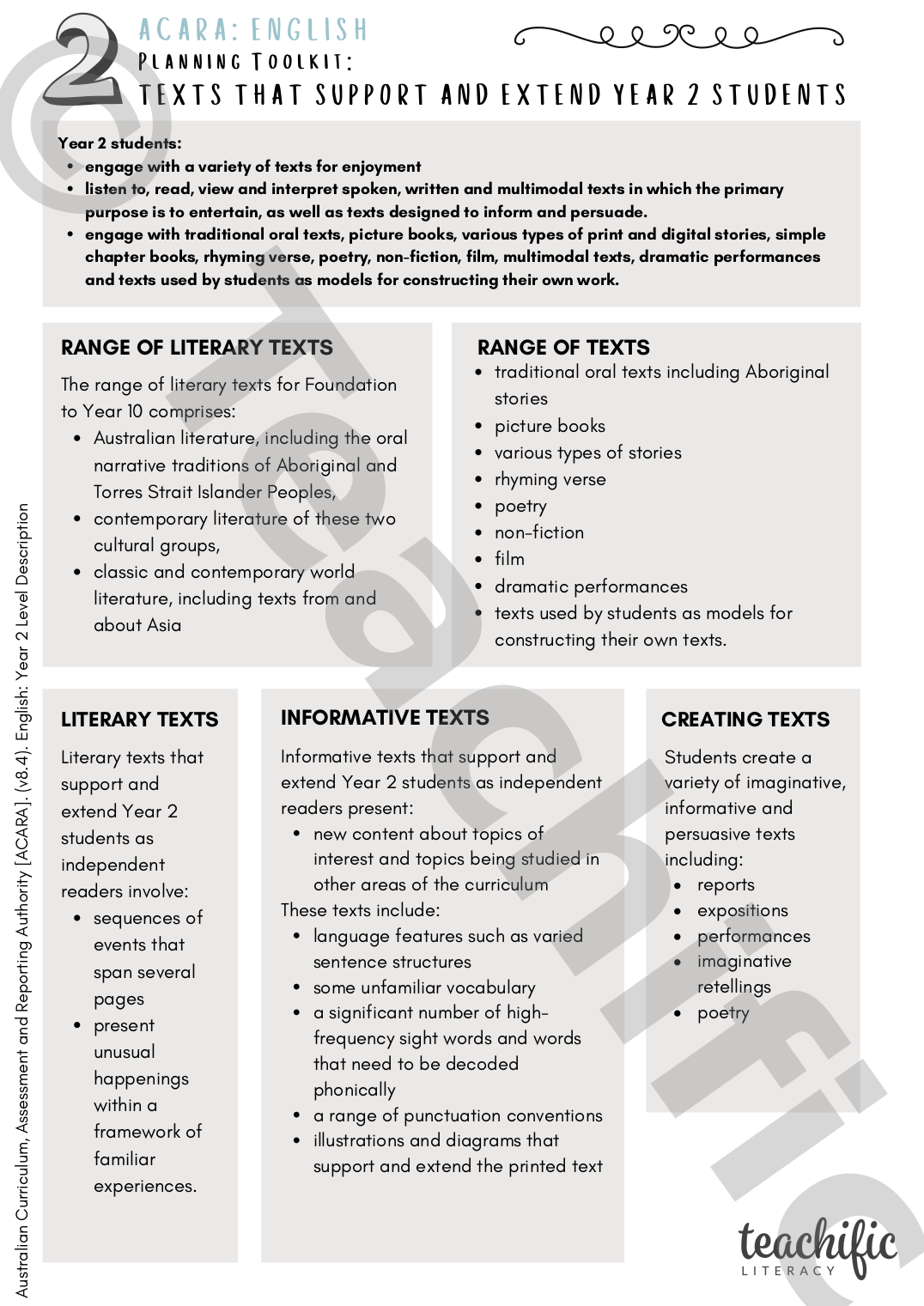 The resource Texts That Support Students: ACARA English, Yr 2, will support you in your planning and assessment.