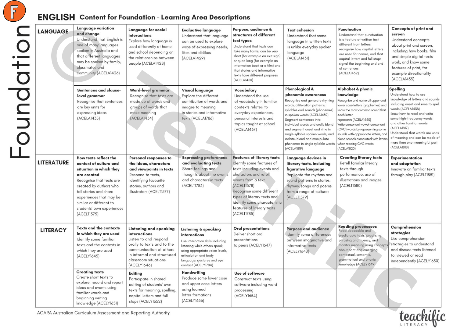 - English Content, Learning Area Descriptions for Yr F. This is is a compact sheet to give you the Australian curriculum at a glance.