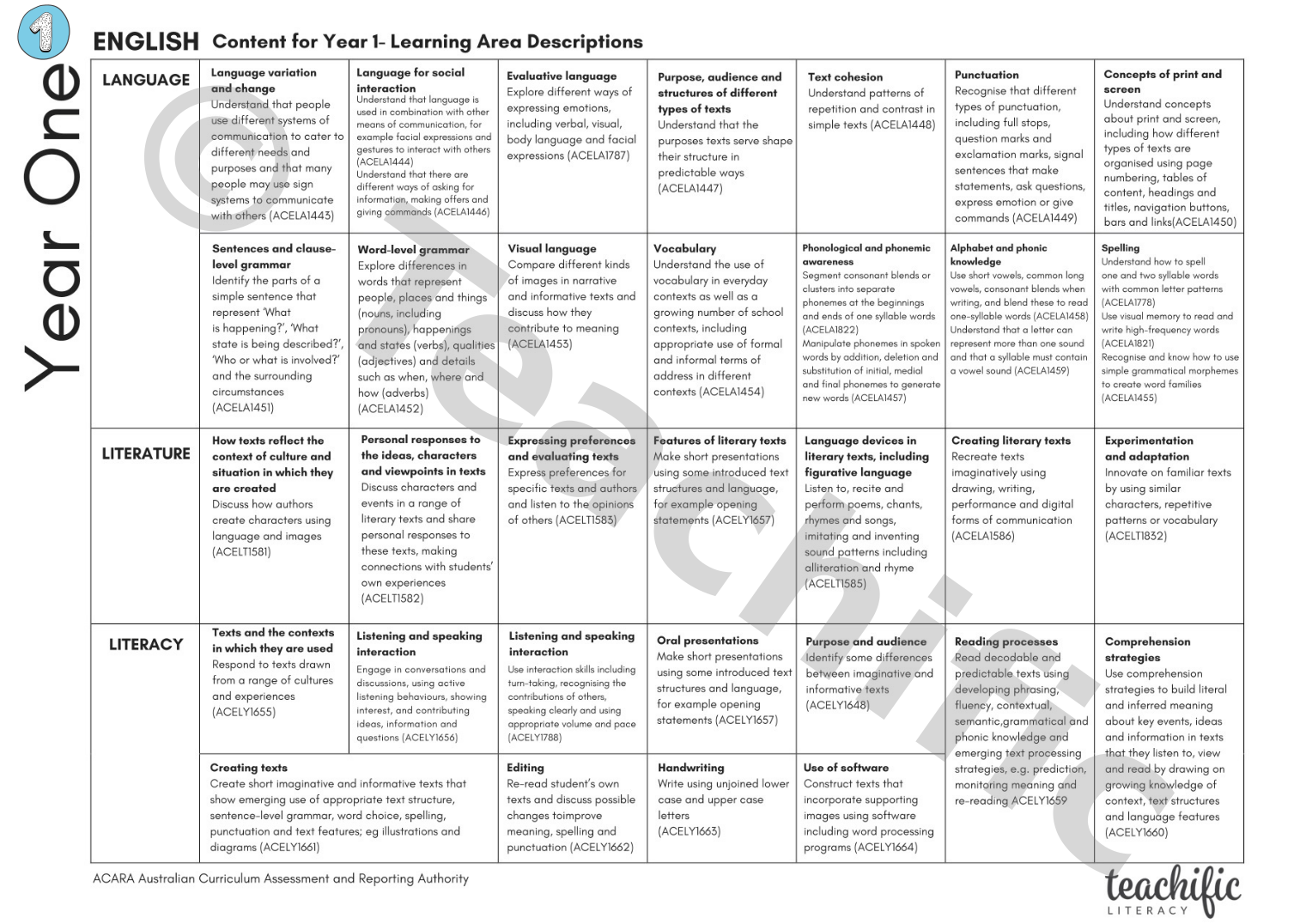 - English Content, Learning Area Descriptions for Yr 1. This is is a compact sheet to give you the Australian curriculum at a glance.