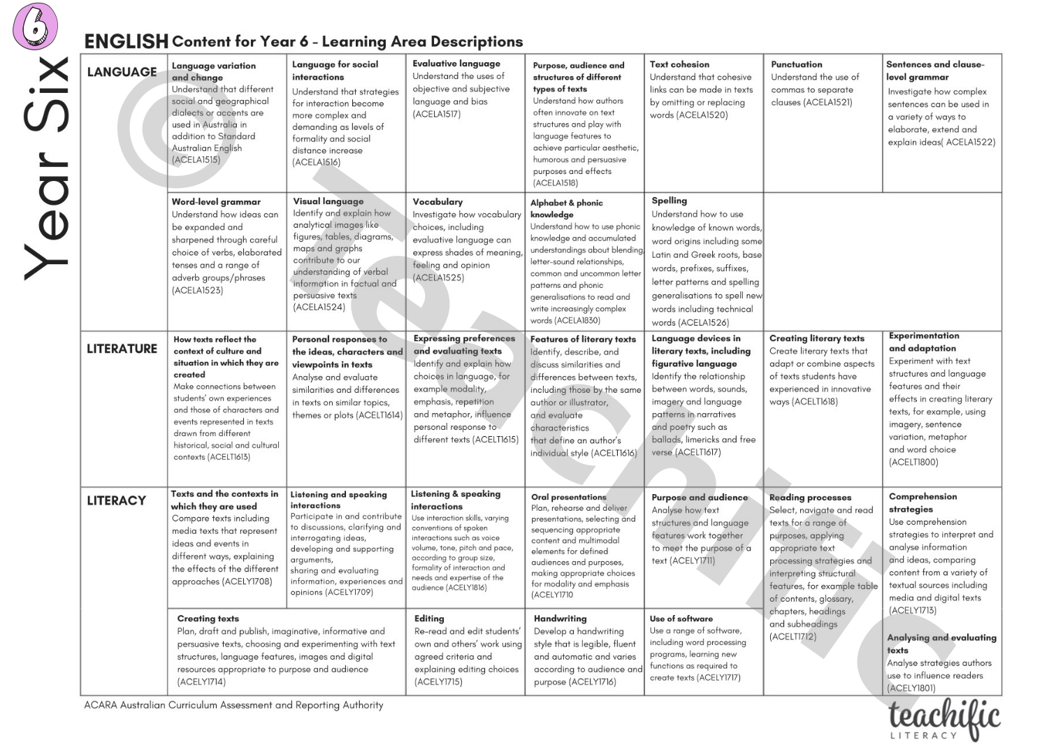 - English Content, Learning Area Descriptions for Yr 6. This is is a compact sheet to give you the Australian curriculum at a glance.