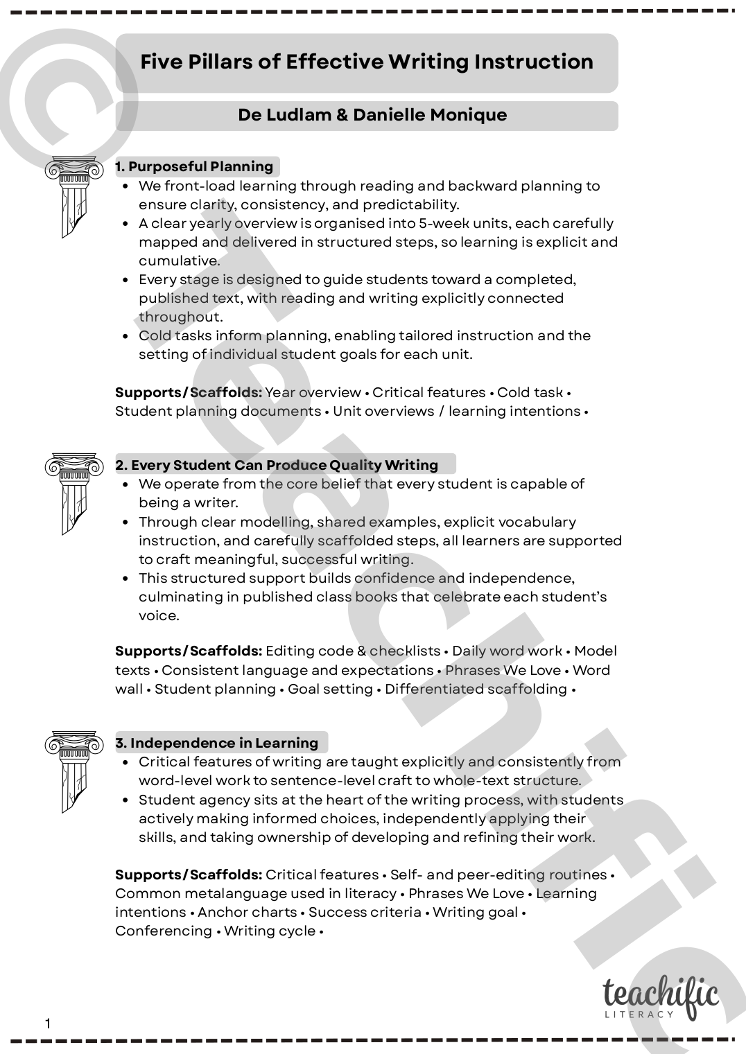 The Five Pillars of Effective Writing Instruction document distils the hard-won classroom wisdom of two extraordinary Year 6 teachers from regional Western Australia into a clear, practical, and deeply considered framework. Each pillar is unpacked in its own right — what it means, why it matters, and what it looks like when it is genuinely embedded in everyday teaching practice.